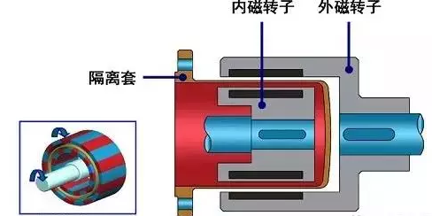 在采用金屬隔離套時(shí),隔離套處于一個(gè)正弦交變的磁場中,在垂直于磁力線方向的截面上感應(yīng)出渦電流并轉(zhuǎn)化成熱量。渦流的表達(dá)式為:。其中Pe-渦流;K—常數(shù);n—泵的額定轉(zhuǎn)速;T-磁傳動(dòng)力矩;F-隔套內(nèi)的壓力;D-隔套內(nèi)徑;一材料的電阻率;—材料的抗拉強(qiáng)度。當(dāng)泵設(shè)計(jì)好后,n、T是工況給定的,要降低渦流只能從F、D、、等方面考慮。選用高電阻率、高強(qiáng)度的非金屬材料制作隔離套,在降低渦流方面效果十分明顯。