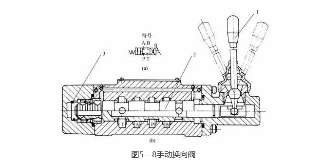 圖5-8(b)為自動(dòng)復(fù)位式手動(dòng)換向閥,放開手柄1、閥芯2在彈簧3的作用下自動(dòng)回復(fù)中位,該閥適用于動(dòng)作頻繁、工作持續(xù)時(shí)間短的場合,操作比較完全,常用于工程機(jī)械的液壓傳動(dòng)系統(tǒng)中。