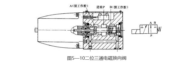 圖5—10為二位三通板式交流電磁換向閥的結(jié)構(gòu)和圖形符號圖。當(dāng)電磁鐵通電時(shí),即推動(dòng)推桿將閥芯頂向右端;又當(dāng)電磁鐵斷電時(shí),閥芯在彈簧的作用下回到左端,從而實(shí)現(xiàn)了油路的換向。