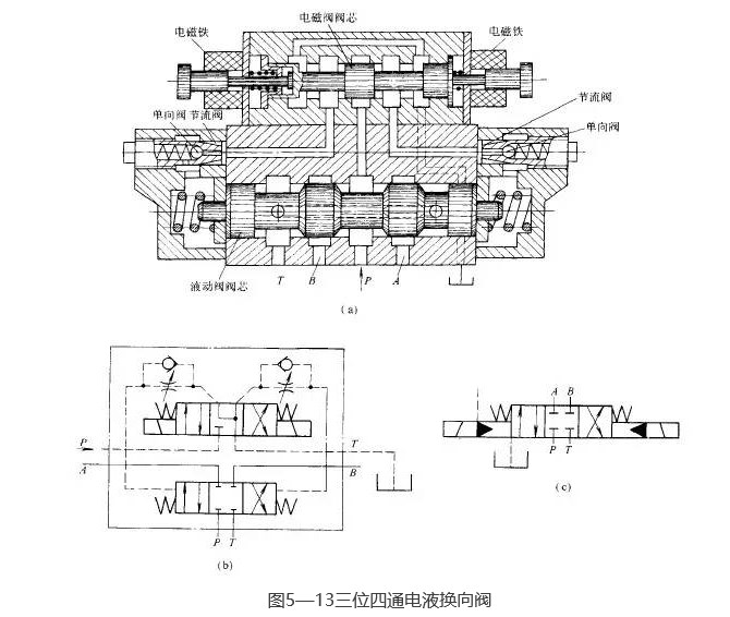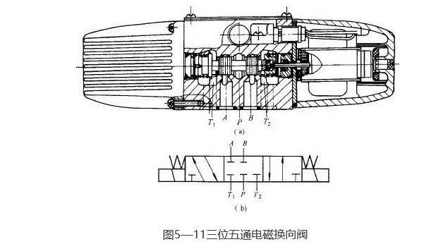 圖5-11所示為35D-25B型三位五通板式交流電磁換向閥的結(jié)構(gòu)和圖形符號圖。當(dāng)左、右電磁鐵均斷電時(shí),其閥芯在兩端彈簧的作用下處于中位(圖示位置);當(dāng)左電磁鐵通電時(shí),即推動(dòng)推桿將閥芯頂向右端;當(dāng)右電磁鐵通電時(shí),即推動(dòng)推桿將閥芯頂向左端,從而實(shí)現(xiàn)了油路的換向。