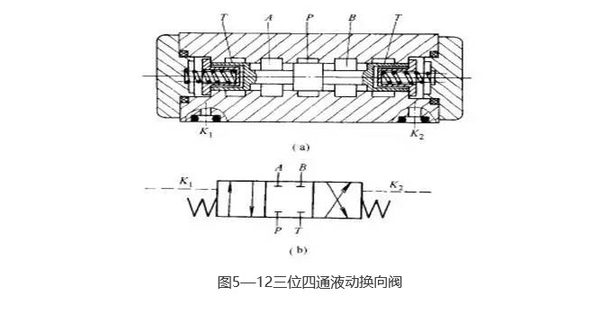 圖5-12所示為液動(dòng)換向閥的結(jié)構(gòu)圖和圖形符號圖。當(dāng)控制油口K1、K2均無控制壓力油通入時(shí),閥芯在兩端彈簧作用下處于中位(圖示位置);當(dāng)K1通入控制壓力油、K2通回油時(shí),閥芯在液壓力作用下克服右端彈簧力移向右端;反之,當(dāng)K2通控制壓力油、K1通回油時(shí),閥芯被推向左端,從而實(shí)現(xiàn)了油路的換向。