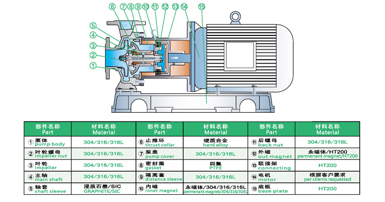 WJC不銹鋼磁力泵過流部件采用全不銹鋼材料(304、316、316L),內(nèi)、外磁轉(zhuǎn)子選用高磁能積、高矯頑力的稀土永磁制造,具有高效節(jié)能、介質(zhì)適用面廣、耐高溫、磁性強(qiáng)、不退磁等優(yōu)點(diǎn),對有機(jī)酸,有機(jī)化合物,堿,中性溶液和各種氣體都有良好的耐蝕性,雙螺旋糟碳石墨軸承和硬質(zhì)合金軸套,具有較強(qiáng)的耐磨性,是應(yīng)用磁力耦合實(shí)現(xiàn)無接觸傳動、無動密封的新型高品質(zhì)磁力化工泵。保證了產(chǎn)品的壽命,是無泄漏輸送腐蝕性介質(zhì)的理想用泵。