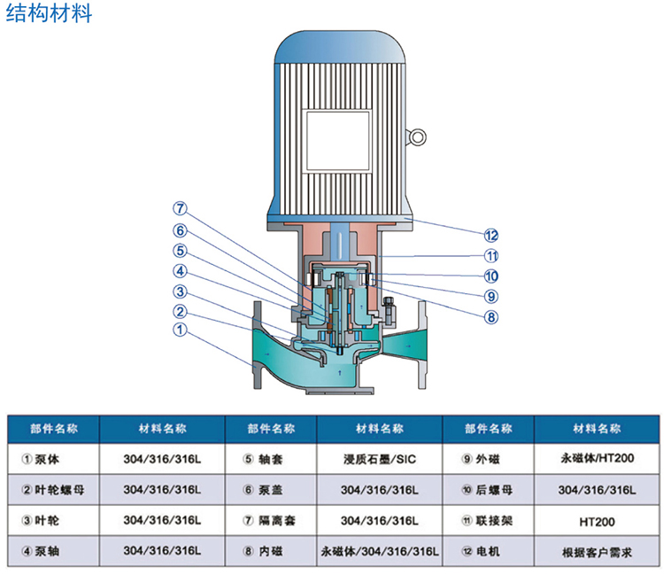 2、材質(zhì)優(yōu)良,泵體、葉輪、隔離套等過流部件均采用優(yōu)質(zhì)不銹鋼制造;
