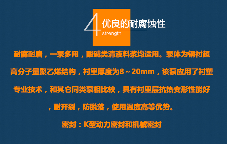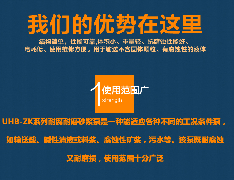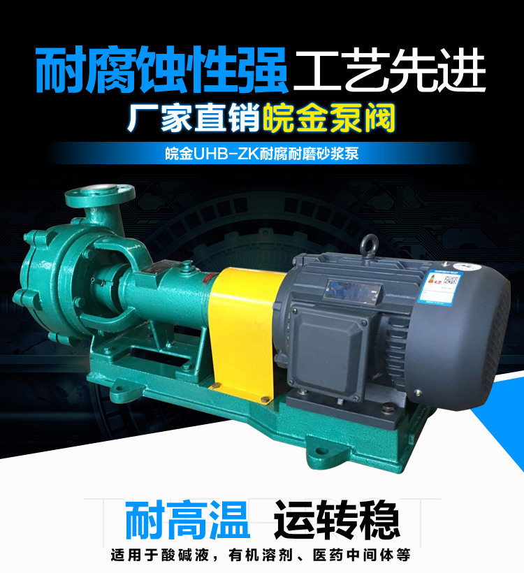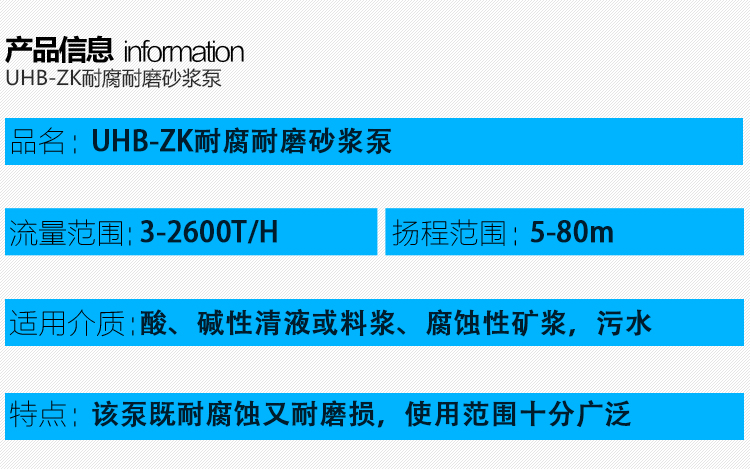 UHB-ZK型系列砂漿泵又稱(chēng)脫硫泵、壓濾機(jī)泵,屬于懸臂式單級(jí)單吸離心泵,是專(zhuān)為輸送含有細(xì)顆粒的腐蝕性介質(zhì)而設(shè)計(jì)開(kāi)發(fā)的,其過(guò)流部件采用鋼襯超高分子量聚乙烯制造,具有較強(qiáng)